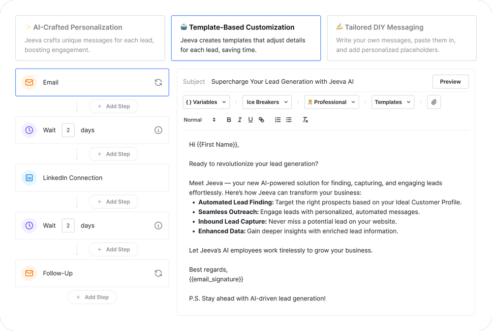 Personalize your emails with a variety of icebreakers, tones, and variables, this helps you resonate with your high-value leads without much effort. You can choose from several templates and pick a tone that suits your brand’s voice.